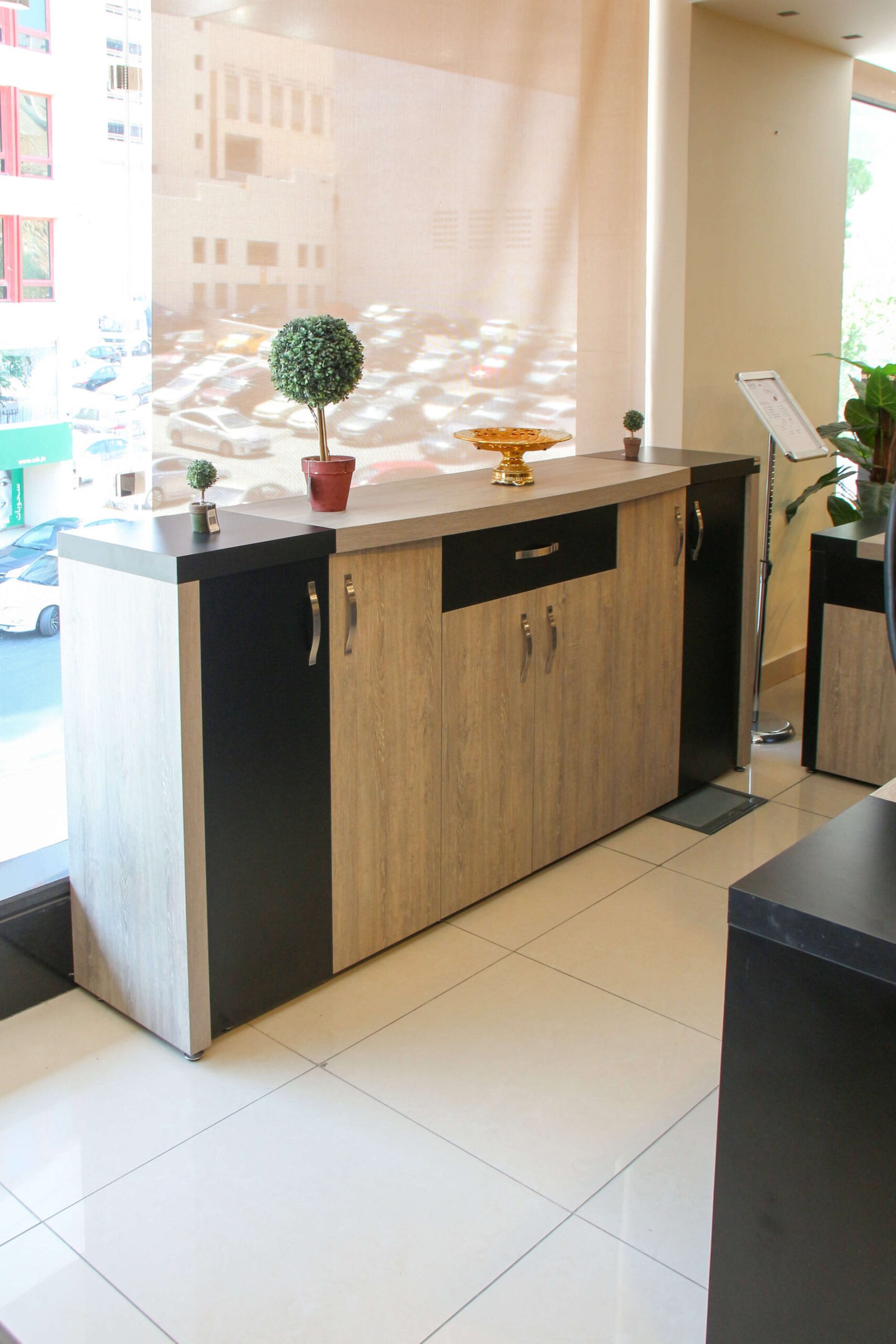 ארון 6 דלתות עם צירים הידראוליים (סגירה רכה), 1 מגירה עם מסילות סגירה רכה, עשוי MFC, עובי החלק העליון 50 מ"מ, מכוסה במלמין משני הצדדים, עם ריפוד PVC בקצוות להגנה נוספת, דלתות בעובי 18 מ"מ.